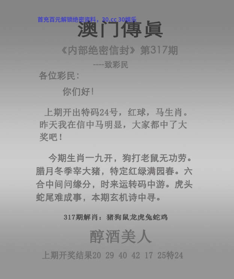 【澳门亿万解传真】317期:今期生肖一九开,狗打老鼠无功劳。腊月冬季宰大猪,特定红绿满园春。六合中间问缘分,时来运转码中游。虎头蛇尾难成事,本期玄机诗中寻。醇酒美人 【澳门亿万主看】猪狗鼠龙虎兔蛇鸡 【澳门亿万主看】红波+绿波 |